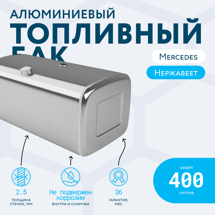 Алюминиевый бак не подвержен коррозии, что делает его более долговечным, а так же сбережет вашу топливную систему. Бак из алюминия в два раза легче стального бака, хотя он и изготовлен из листа увеличенной толщины в 2,5 мм. В конструкции предусмотрены цельные перегородки, которые проварены по периметру. Баки из алюминия так же оснащены заливной горловиной с самозапираемым непроливаемым клапаном (который становится барьером для разлива топлива, а так же становится защитой от попадания мусора в бак при открытой крышке) . Кроме того, однозначно что алюминиевый бак выглядит намного привлекательнее и дороже - где бак в том числе становиться и элементом тюнинга автомобиля. На алюминиеввые баки действует увеличенная гарантия - 36 месяцев.