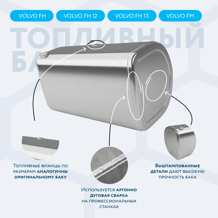 Алюминиевый бак не подвержен коррозии, что делает его более долговечным, а так же сбережет вашу топливную систему. Бак из алюминия в два раза легче стального бака, хотя он и изготовлен из листа увеличенной толщины в 2,5 мм. В конструкции предусмотрены цельные перегородки, которые проварены по периметру. Баки из алюминия так же оснащены заливной горловиной с самозапираемым непроливаемым клапаном (который становится барьером для разлива топлива, а так же становится защитой от попадания мусора в бак при открытой крышке) . Кроме того, однозначно что алюминиевый бак выглядит намного привлекательнее и дороже - где бак в том числе становиться и элементом тюнинга автомобиля. На алюминиеввые баки действует увеличенная гарантия - 36 месяцев.